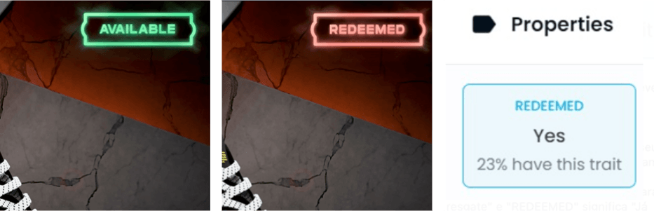 Ressalte-se que se você estiver comprando o NFT diretamente de algum holder, ou seja, no mercado secundário (ex: OpenSea), é possível saber se um NFT já teve seu par físico resgatado observando o canto direito superior de sua arte, em que "AVAILABLE" significa "Disponível para resgate" e "REDEEMED" significa "Já resgatado", conforme imagem disposta abaixo.
